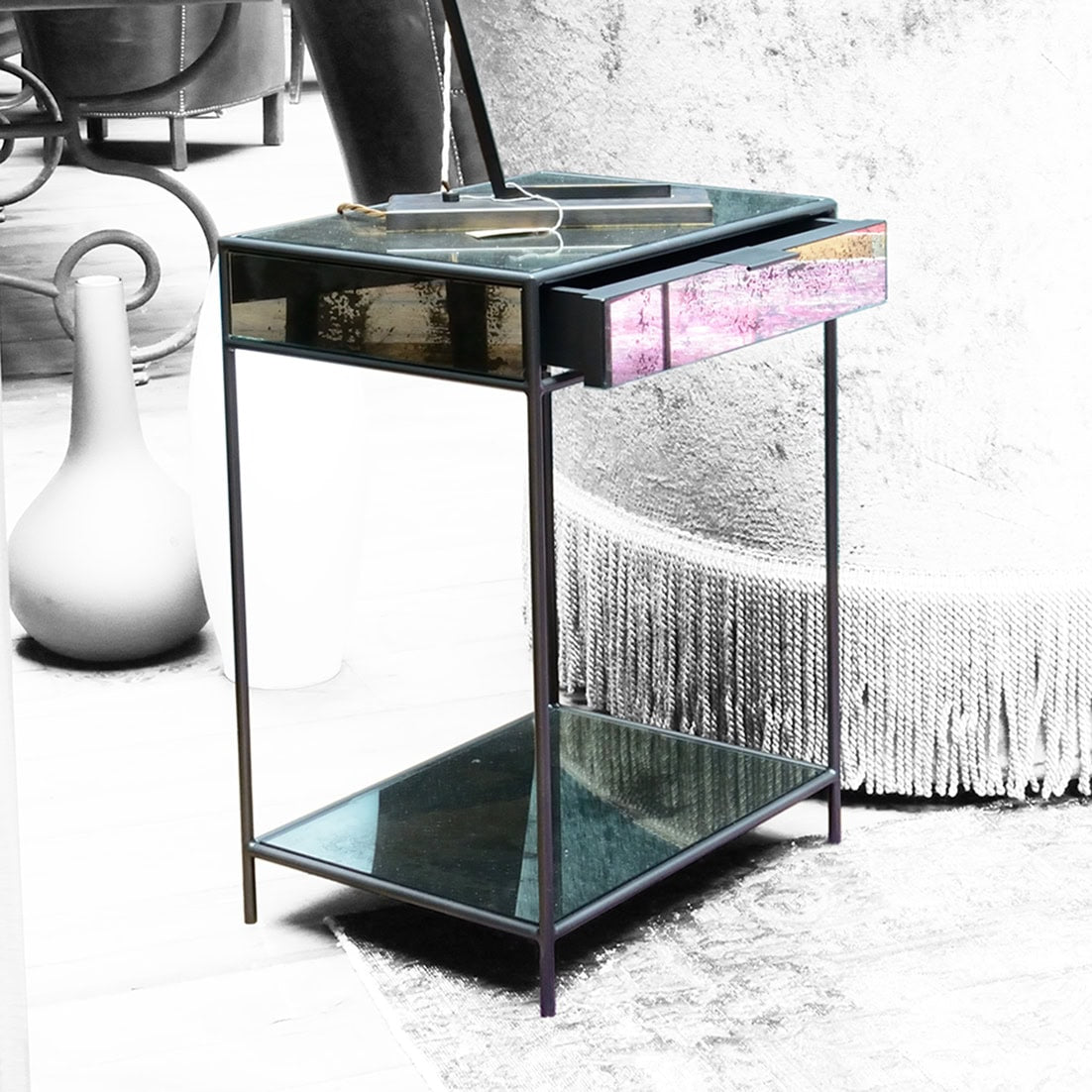 Silbrig schimmerndes Glas und das fein gearbeitete stählernde Gestell lassen den Nachttisch grazil und leicht erscheinen. Passend zum nächtlichen Mondschein, der sich in den hochwertigen Gläsern spiegeln kann und das märchenhafte und zugleich klare Aussehen des Möbelstückes unterstreicht, heißt dieser Nachttisch "moon table". Der Nachttisch mit Schublade wird in England handgefertigt.